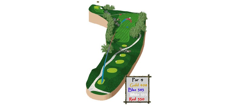 On No. 7, a par-4 that measures 360 from the back tees and 265 from the forward – you must hit a tee shot to a very tight uphill fairway. Use a three-wood for your drive instead of a driver. Your short second shot must sail up to a rolling, undulating green that is only 26 yards deep.